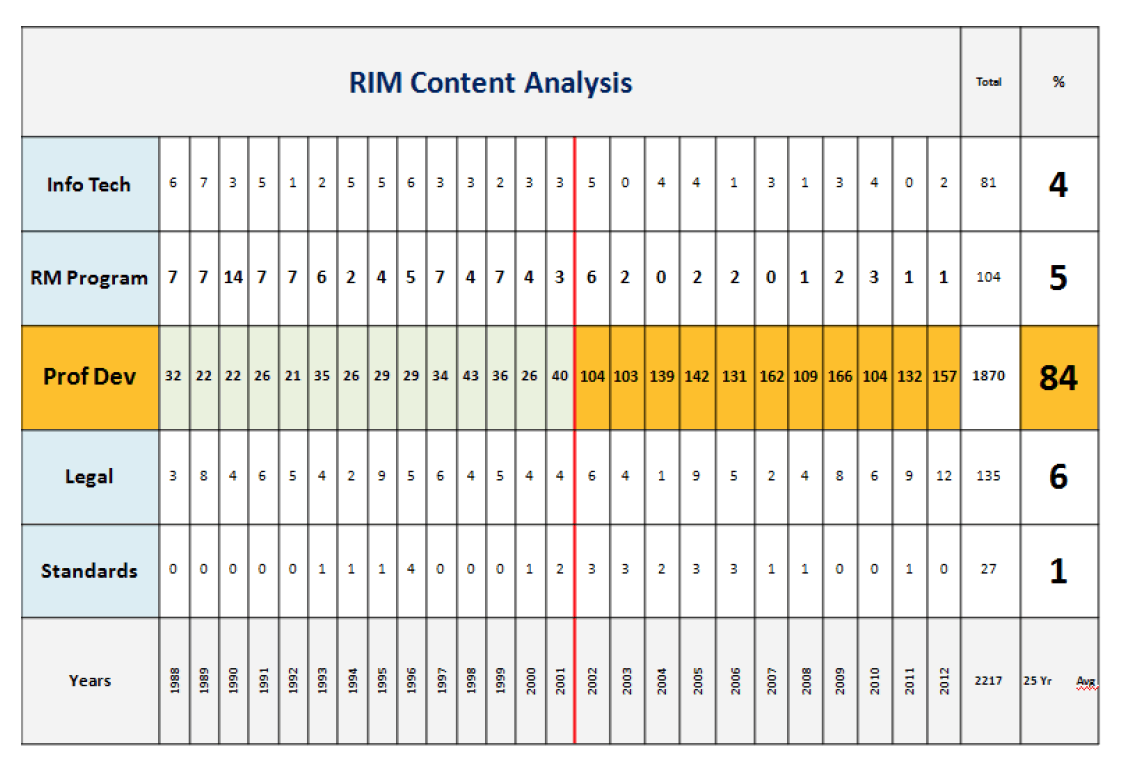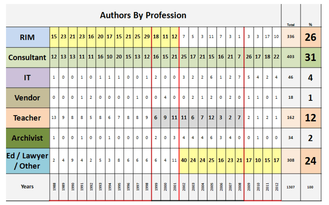 One of the focuses in John Bolton’s article, “A Content Analysis of Information Impact: Professionalism or Not – A Critical Twenty-Five Review “ is a question that RIM practitioners have been asking on and off for many years; is records management a profession? He delves more deeply into that question by reviewing ARMA International’s Information Management (previously entitled Information Management Journal, and Records Management Quarterly) articles.