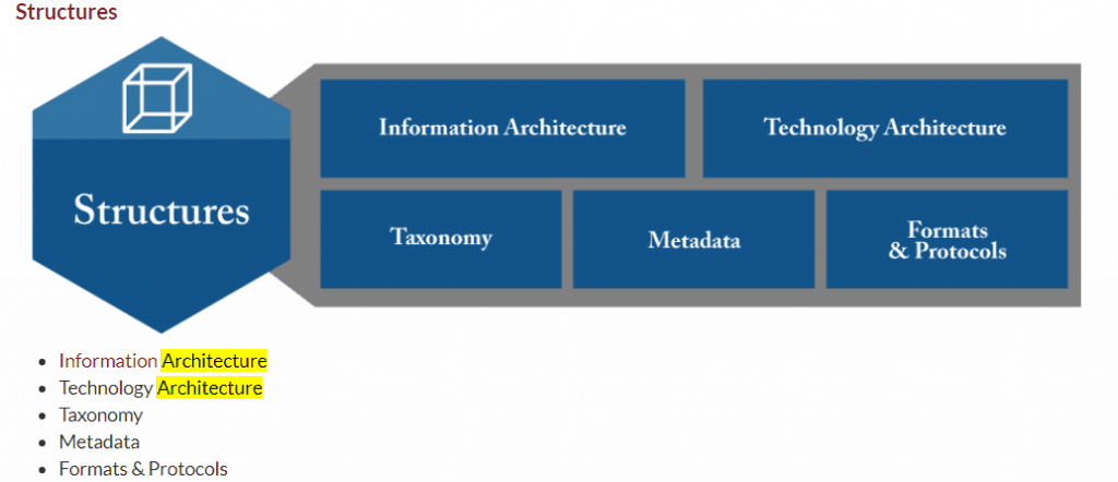 An immediate and useful ARMA resource is the free, five-page document called The ARMA Information Governance Implementation Model (IGIM) which, in November 2019, remained in the BETA publishing stage. Among the seven models which attempt to connect the various stakeholders of Information Governance, the ‘Architecture’ references were displayed within the SUPPORTS function.