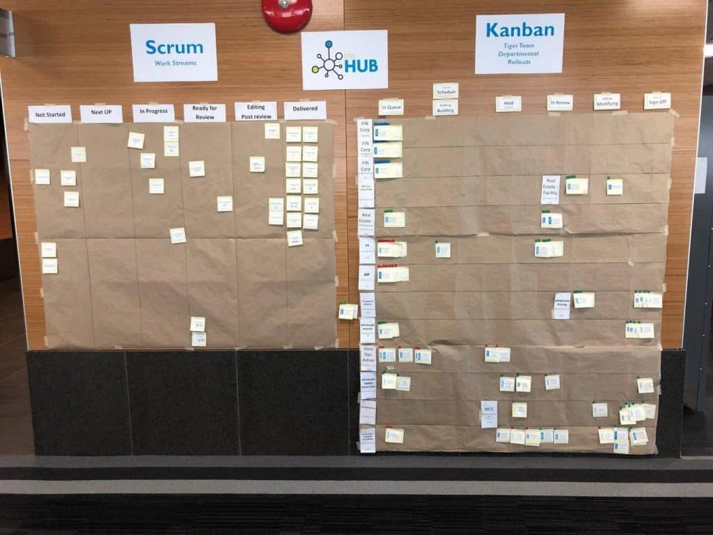 A master Kanban board tracked progress across all departments. Kanban is a lean method from Japan to visually manage work and to give team members a view of their progress and overall process. Kanban—which is the Japanese word for “billboard”—was developed by an automobile manufacturer in the 1940s and 1950s.