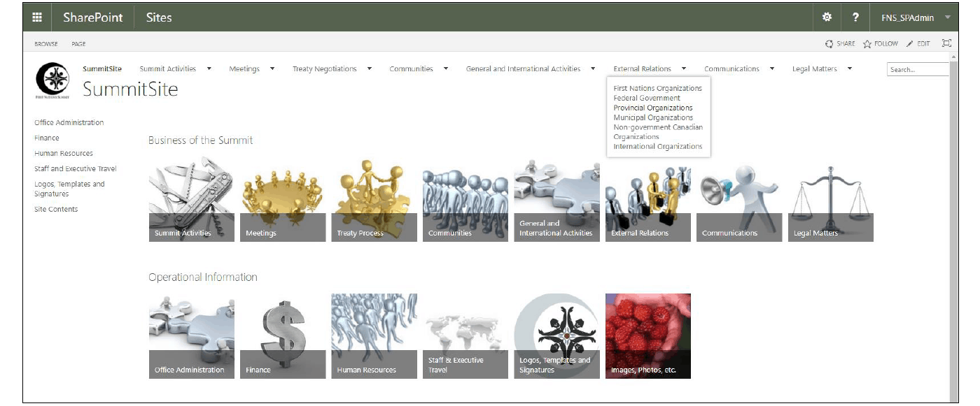 Le développement de la structure et de la disposition de la page d’accueil a été largement influencé par l’utilisation des employés — il a été déterminé que la meilleure façon de procéder était de suivre la structure de classification la plus élevée, partant de catégories larges comme point de départ jusqu’à l’organisation plus granulaire des documents. Chaque catégorie est affichée sur la page d’accueil avec sa propre icône afin d’être facilement identifiée et  sélectionnée  par  les  utilisateurs.  Les  sections  les  plus souvent consultées regroupées dans la rubrique « Summit Activities » sont également énumérées dans un menu au haut de l’écran, avec des sous-catégories énumérées lorsque le curseur y est pointé.